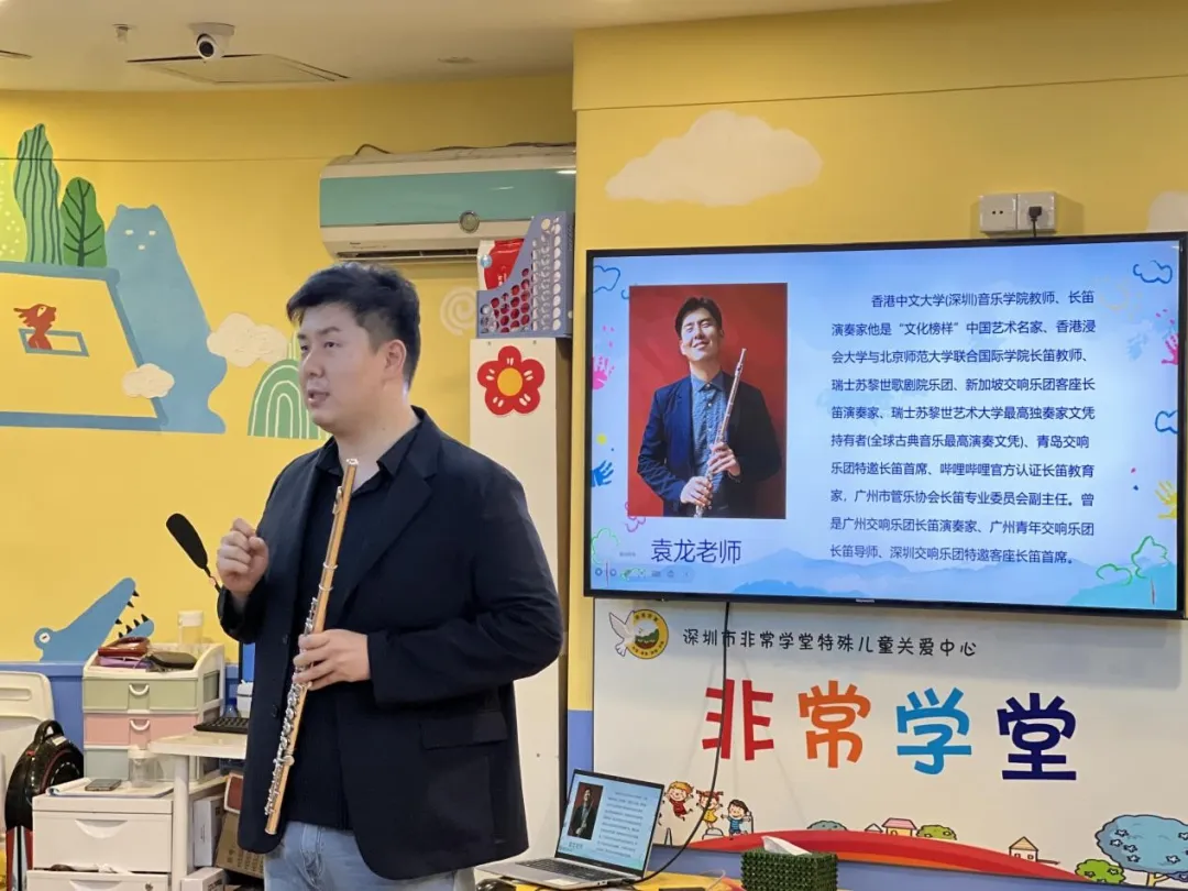 揭幕仪式后,港中大(深圳)音乐学院助理教授、小提琴演奏家Stanislav Pronin老师和长笛演奏家袁龙老师在市儿童医院Vcare关爱空间为小患者们分别演奏了《Jasmine Flower & Bach's Cello Suite No. 6》和《天空之城》。随后,港中大(深圳)的学生代表也在关爱空间开展了关爱日第一期的活动,和小患者一起做贴画和唱歌。