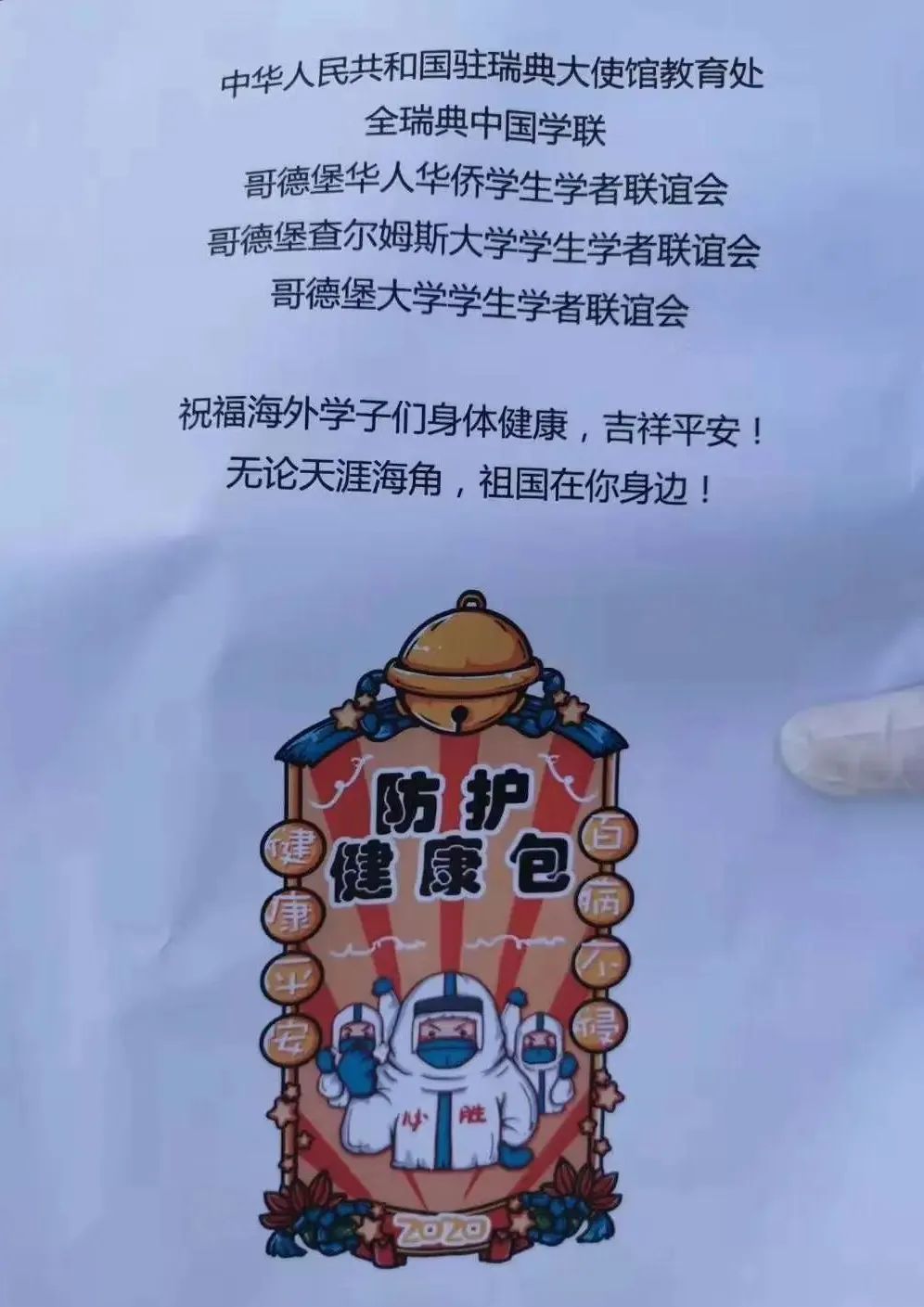 瑞典哥德堡情况相对稳定,但是大家都没有严格居家隔离,出门也并未全部戴口罩,情况不容乐观。“大使馆很贴心地为我们提供了健康包,里面有N95和一次性口罩,还有消毒湿巾和两盒莲花清瘟,使我非常感动。之前发布的防疫指南和疫情期间的建议,使我们安心不少。”
