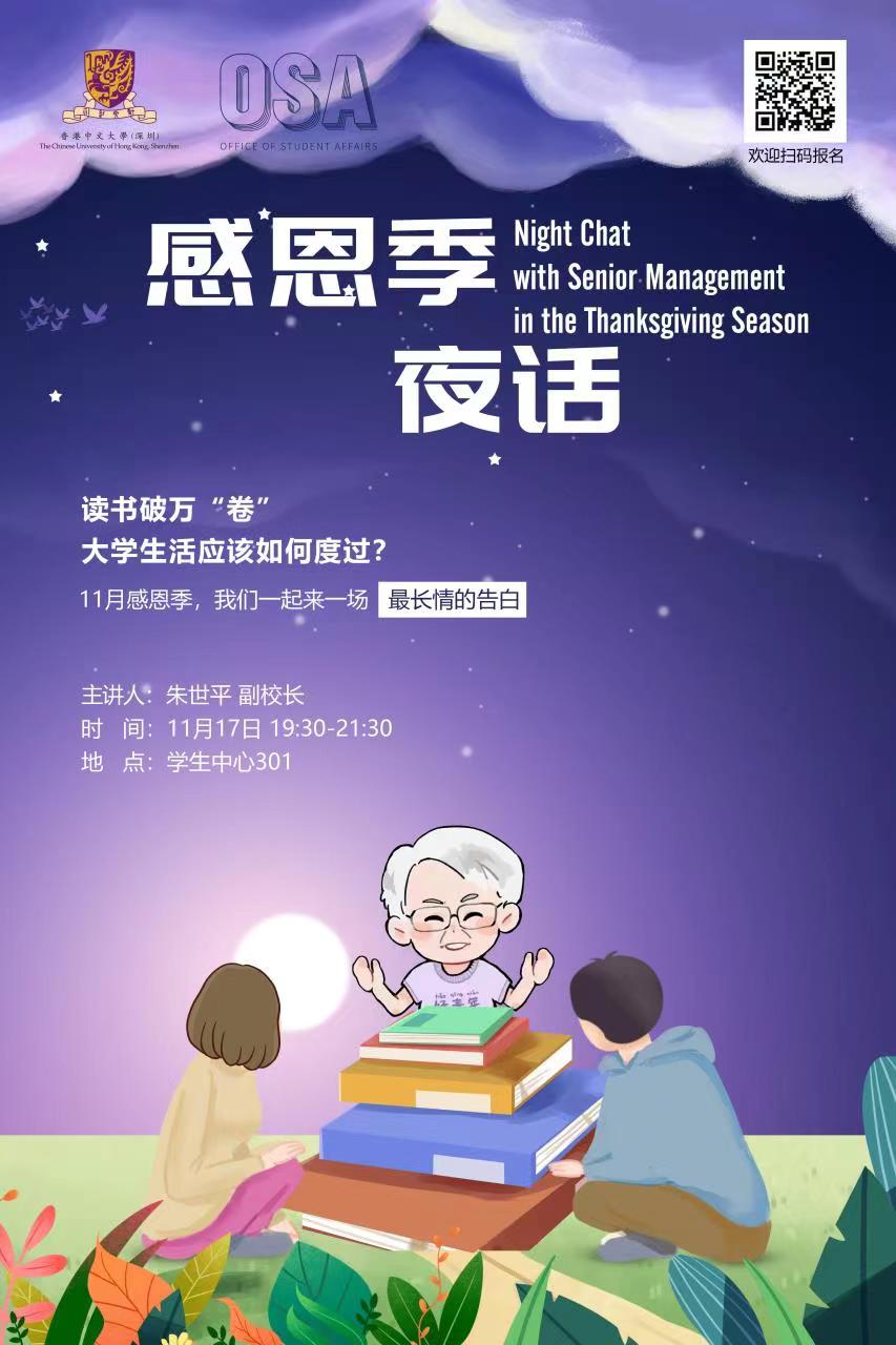 学生活动 学生组织 活动预告 社会实践 精彩回顾 学生风采 首页 学生活动 活动预告 感恩季夜话:与大学主管人员面对面 感恩季夜话:与大学主管人员面对面 2022.11.10 11月17日,19:30- 21:30 学生中心301室 高层夜谈是港中大(深圳)的传统,学生与高层可以直接沟通交流。 在这个特殊的感恩节季节,我们很高兴邀请您从各个方面谈论教育、事业、爱情、家庭、心理健康等话题。 详细资料主讲人:副校长朱世平教授日期和时间:2022年11月17日,星期四,19:30-21:30地点:学生中心301室语言:中文 报名https://wj.cuhk.edu.cn/vm/YjDAA19.aspx 报名截止日期:2022 年 11 月 17 日,星期四,上午 11:59 网页编辑:谢子钰 上一篇 返回列表 下一篇